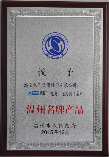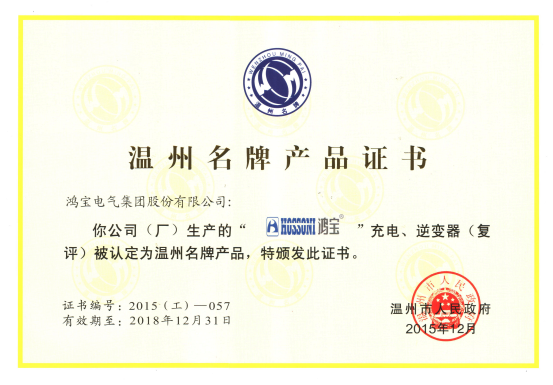 本报讯: 鸿宝公司全体员工在鸿宝集团董事会的正确指导下,齐心协力改进产品质量,提升产品品质,获得广大消费者好评,于2015年12月,“”牌充电、逆变器(复评)被温州市人民政府认定为温名牌产品。