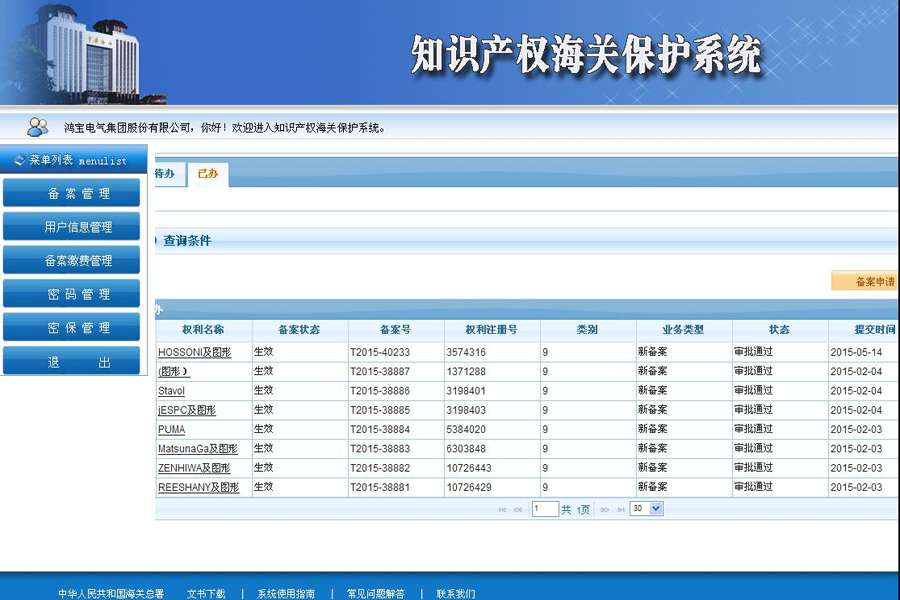 本报讯:2015年2月至5月间,鸿宝电气集团股份有限公司8款商标在中华人民共和国海关总署知识产权保护系统成功备案,备案的商标有:鸿宝牌英文商标
