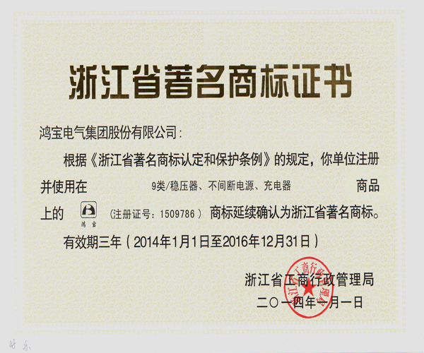 鸿宝商标自2004年被评为“浙江省著名商标”以来,凭借良好的市场知名度、美誉度及优越的产品品质和品牌价值,再次被延续确认为“浙江省著名商标”。
